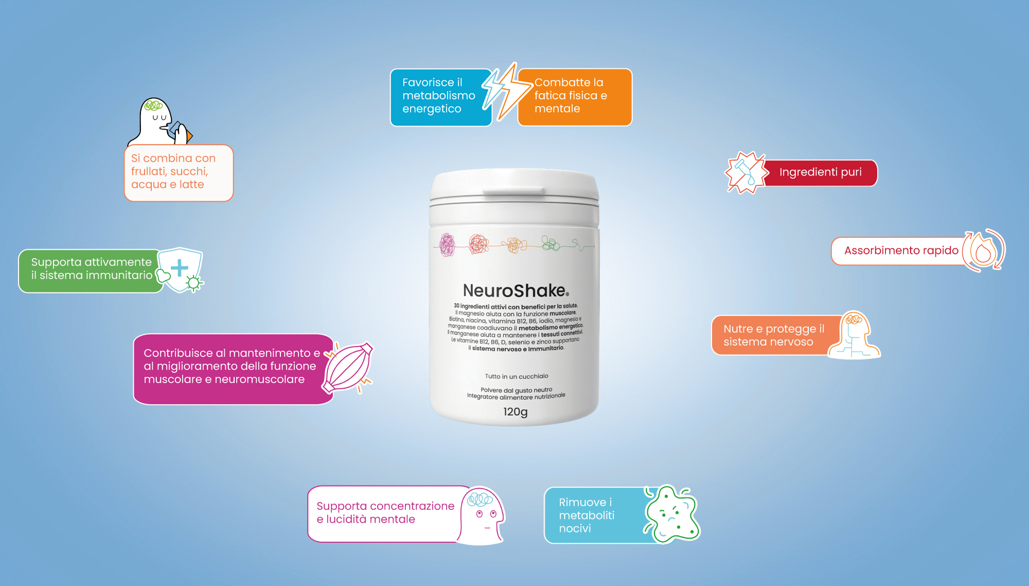 NeuroShake contiene 30 vitamine, minerali e cofattori altamente efficaci, tra cui lo iodio per supportare la normale funzione cognitiva, la biotina per supportare il metabolismo dei macronutrienti e il magnesio per supportare la normale funzione muscolare. Le vitamine B12 e B6 contribuiscono al normale funzionamento del sistema nervoso e alla riduzione di stanchezza e affaticamento.